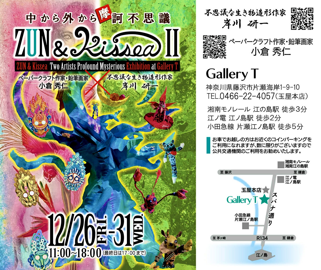 ペーパークラフト作家・鉛筆画家のZUN 小倉秀仁さんと、湘南の幻想アーチスト不思議な生き物造形作家 KISSEA岸川 の中から外から魔訶不思議展覧 Ⅱ が江ノ島ギャラリーTで始まります。二人のこのテーマでの二人展は二回目の開催、1回目は日本橋のアートモールでした。中から外から自信を見つめる世界を創作する魔訶不思議な展覧会です。
